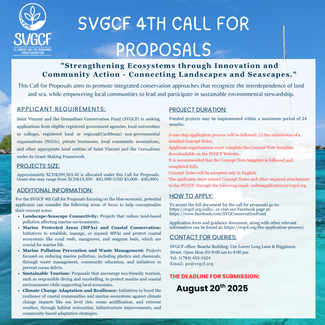 The Saint Vincent and the Grenadines Conservation Fund (SVGCF) is seeking applications from eligible registered government agencies, local universities or colleges, registered local or regional (Caribbean) non-governmental organizations (NGOs), private businesses, local community associations, and other appropriate local entities of Saint Vincent and the Grenadines under its Grant-Making Framework.
